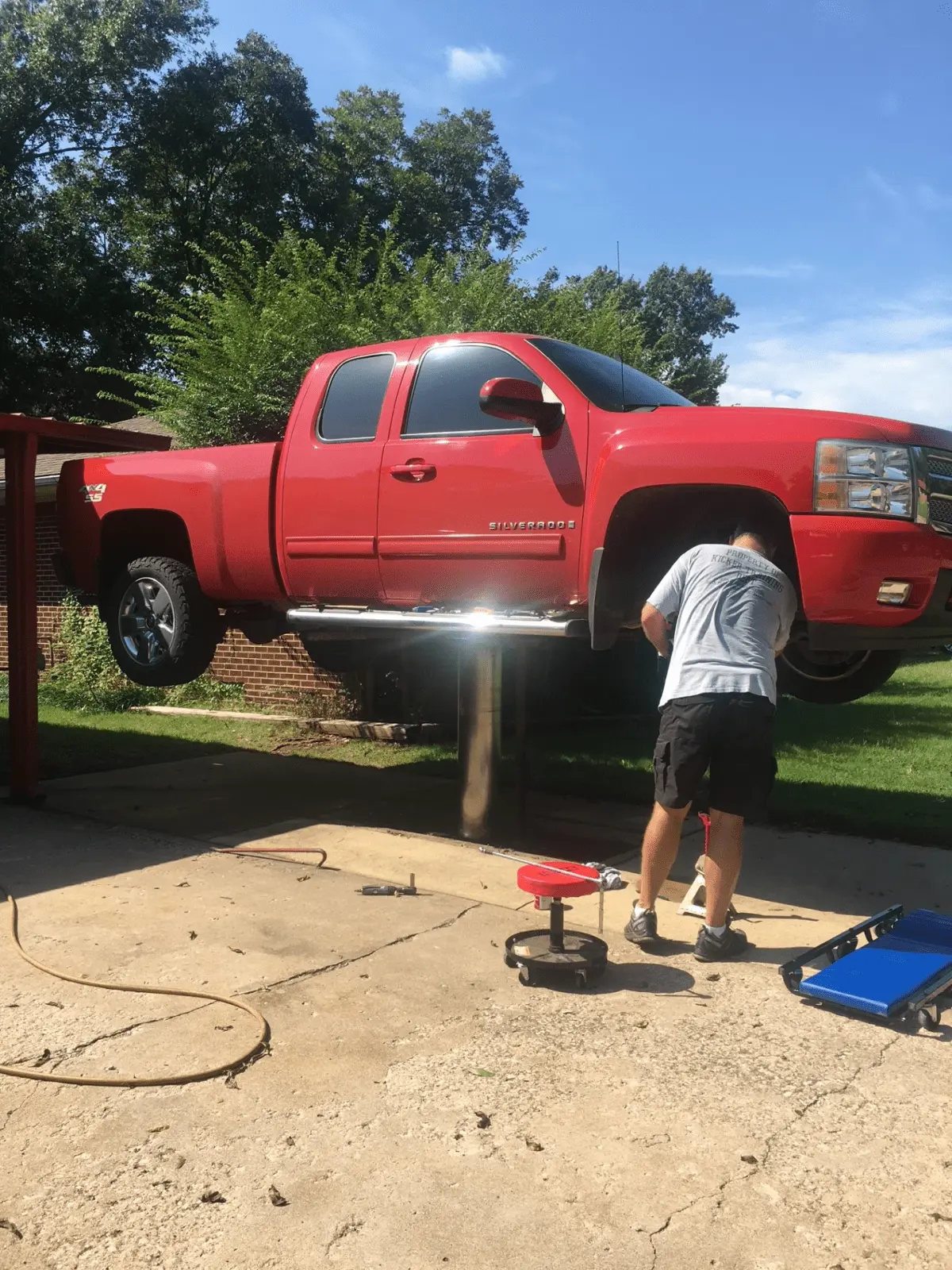 I did mine in the driveway and I did not drop the spare because that only helps if you have a lift, so you have head clearance. I chocked up the front wheels and jacked up the truck under the reciever so the suspension was fully extended. Once you get the bags in place, you'll lower it some to get the bolts installed. Once you have the bags secured drop it again to install air compressor and lines.