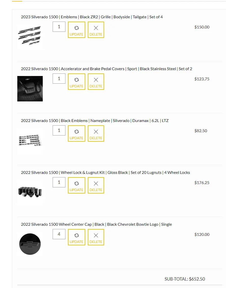Here is a picture of my cart from shopchevyparts.com these items are about $900 after tax and delivery seems a bit steep for what I am getting. Have looked at similar stuff on Amazon but not sure of quality or fit. Any recommendations?