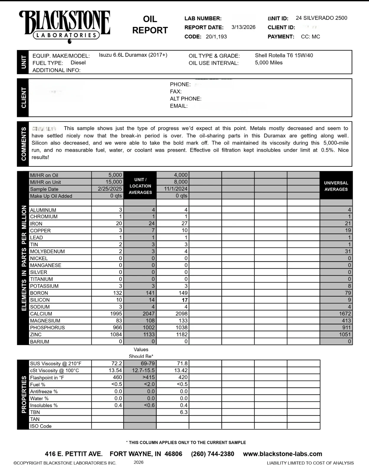 I pulled another Rotella T6 oil sample at 15k miles and sent it to Blackstone for analysis. Looks like it's pretty well worn in and no surprises. I had a lot of tow miles (some at 12k lbs and many at 7k lbs) and higher speed highway travel going hunting and to the sand dunes.