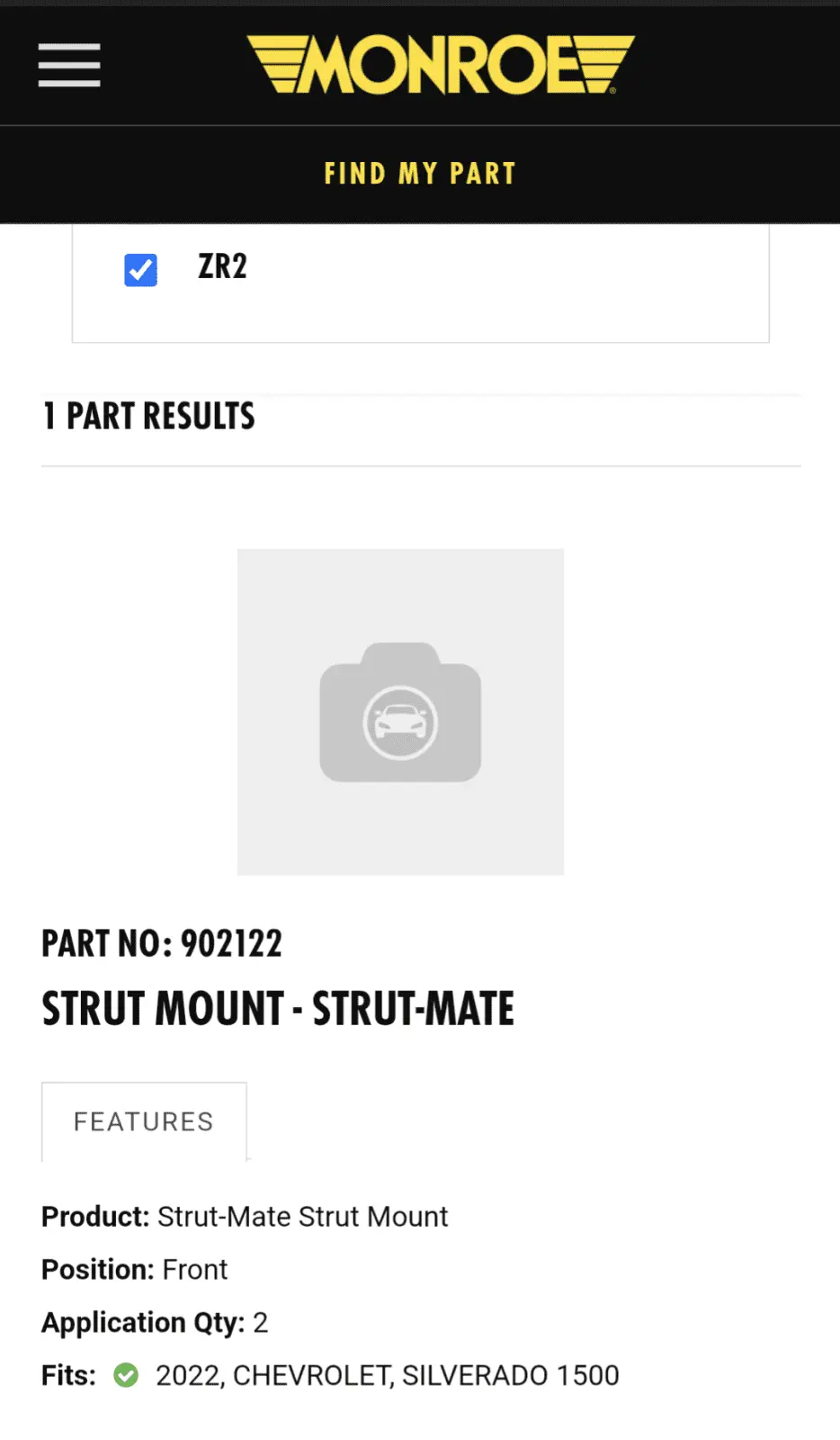 i did the same thing...looked up zr2 and nothing. @securityguy has been known to be a troublemaker.That's a generous deal. I think Monroe only sells strut mate/mount for front