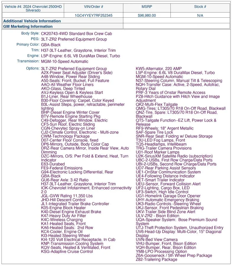 It appears that my dealer buddy has three BLACK 2500HD ZR2 Bison's coming in soon...hopefully. Two are identical in options and the third without the power retractable step. I want the step so that takes me down to two. The cost is about $9500 more than the one I placed on order and it has far more than what I really want or need (sunroof as an example plus the Bison package which I really didn't want/need). My buddy is willing to sell me this truck for just over $88K (Supplier is $90,612) so I said what the hell and locked it down so I have first right of refusal upon delivery. I have attached the build below. It is showing in 3800 status now and I'll get another update in a few weeks. It was built the week of September 25.