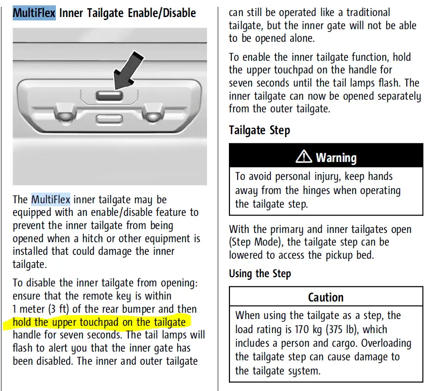 I held just the top button for 7 seconds (with the key fob in my pocket) and it toggles between lockout and regular function of the top section of the multiflex tailgate.THANK YOU... I was just trying to figure out why my top section just stopped working!!!