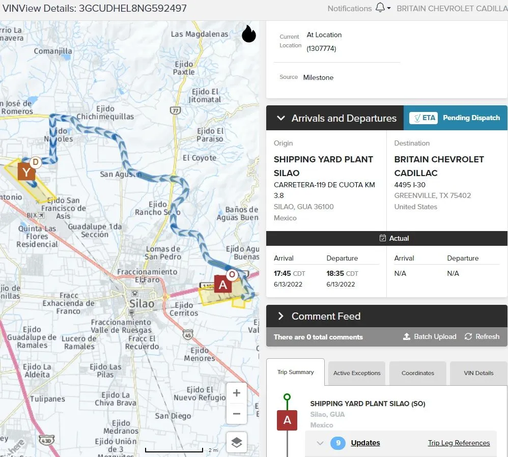 I hope you can help. I have seen my dealers screen that shows 4200 status on 5/31. You stated you still see it in 3800 status and the dealer can not track vin number yet even though they have one provided which means it may still be in TJ from 5/31??