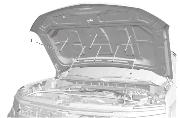 6. Using a suitable plastic trim tool, carefully release the [14x] hood center molding retainers (1).