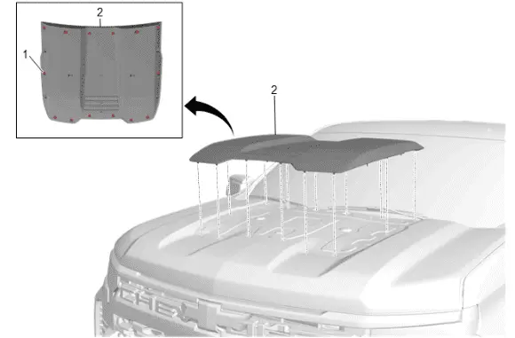 - Ensure all of the hood center molding retainers (1) are fully seated. Hand tightened, not too tight.