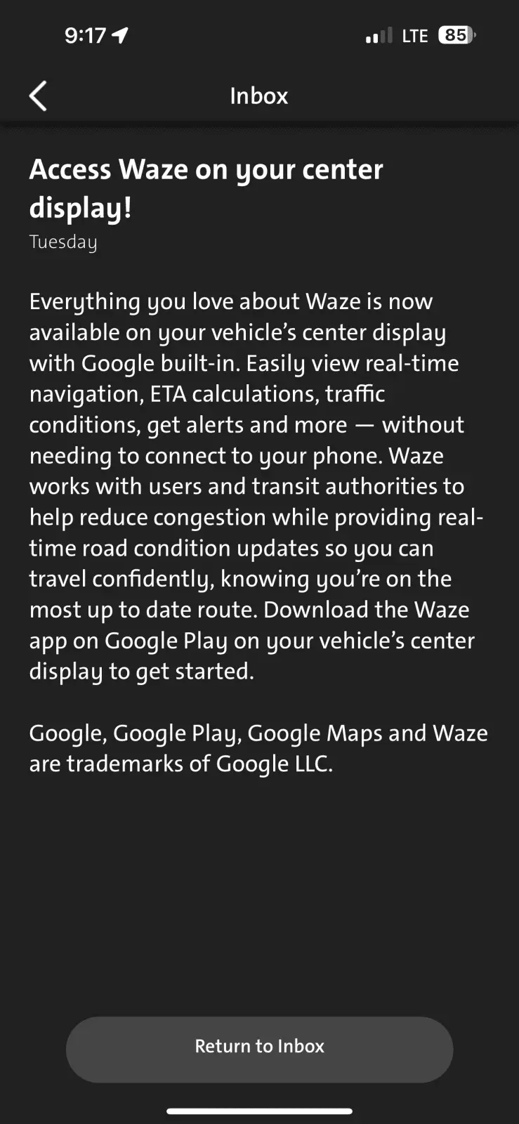 I use Android Auto which mirrors my phone on the infocenter and that's the way I use Waze. I wasn't aware that Waze was also available as a stand alone app on the infocenter. To me Waze is way more precise and accurate then Google maps and I really like having the police warning updates along your route.Anybody else seen this message on your MyChevrolet app? Or how to access it? I’ve got an oil change coming up I’ll probably ask them about it then…. I searched the infotainment system and didn’t see it. Not on the settings for Google Maps either..