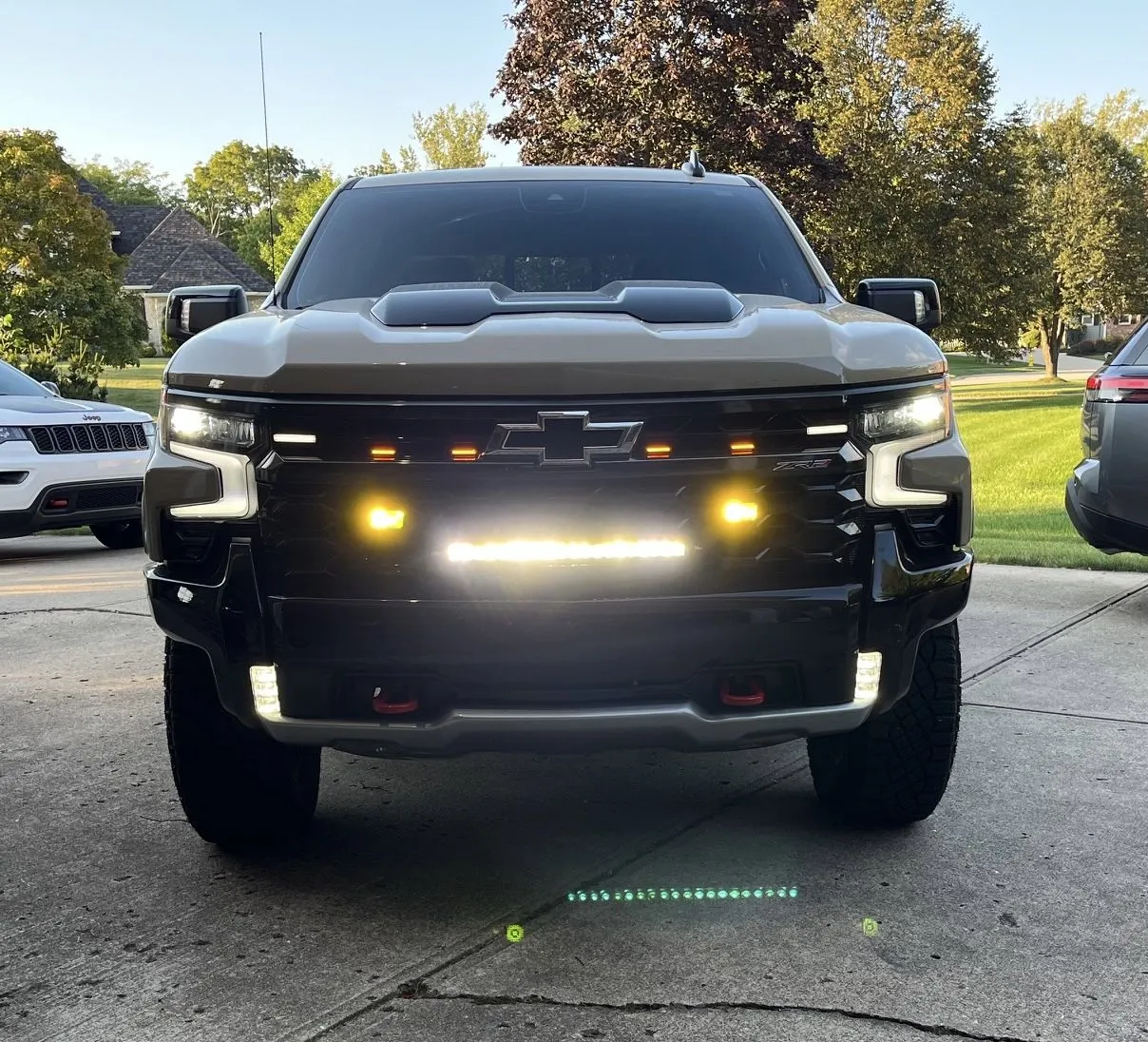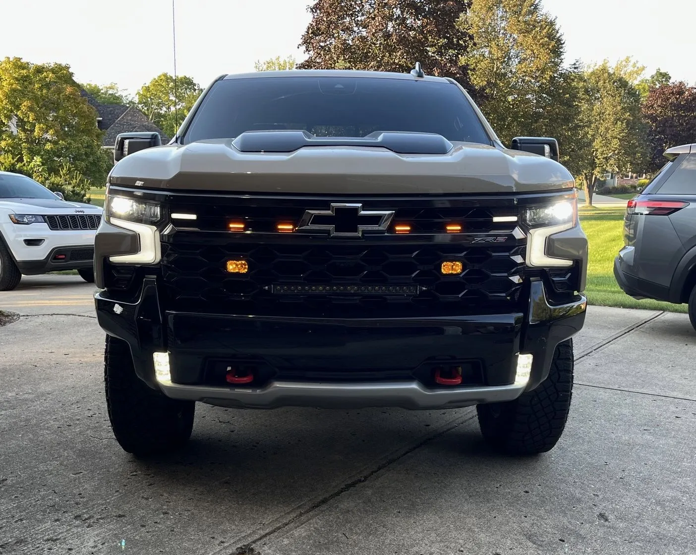 Well done............Chopped out some honeycombs in the grille to push my Rigid light bar out (too much light loss when mounted behind grille). And made room for a couple Diode Dynamics combo ambers. They work as DRLs and combo fog/driving when activated.